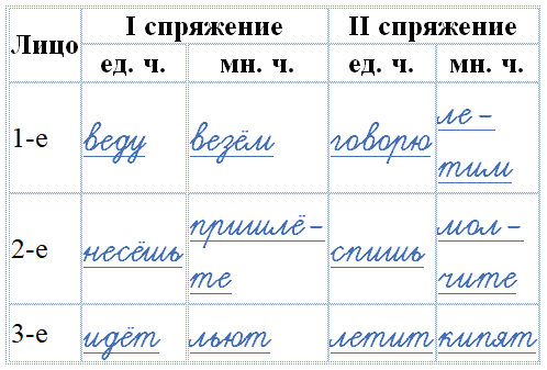 | Лицо | I спряжение | II спряжение | ||