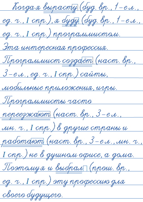 Когда я вырасту (буд. вр., 1-е л., ед. ч., I спр.), я буду (буд. вр., 1-е л., ед. ч., I спр.) программистом. Эта интересная профессия. Программист создаёт (наст. вр., 3-е л., ед. ч., I спр.) сайты, мобильные приложения, игры. Программисты часто переезжают (наст. вр., 3-е л., мн. ч., I спр.) в другие страны и работают (наст. вр., 3-е л., мн. ч., I спр.) не в душном офисе, а дома. Поэтому я и выбрал (прош. вр., ед. ч., I спр.) эту профессию для своего будущего.