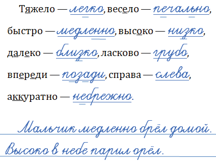 Тяжело — _______, весело — _______, быстро — _______, высоко — _______, далеко — _______, ласково — _______, впереди — _______, справа — _______, аккуратно — _______.