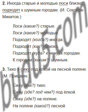1. Крепко спит заснеженный лес. (Г. Скребицкий.) 2. Иногда старые и молодые лоси близко подходят к шумным городам. (И. Соколов-Микитов.) 3. Тихо я сижу под ёлкой на лесной поляне. (М. Пришвин.)