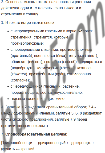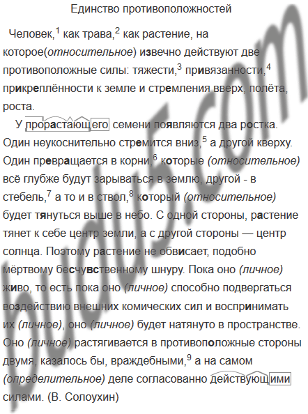 У прор..стающего семени по..вляются два р..стка. Один неукоснительно стр..мится вниз а другой кверху. Один пр..вр..щается в корни к..торые всё глубже будут зарываться в землю, другой в стебель а то и в ствол к..торый будет т..нуться выше в небо. С одной стороны, р..стение тянет к себе центр земли, а с другой стороны — центр солнца. Поэтому р..стение не обв..сает, подобно мёртвому бе..чу(вс, с)твенному шнуру. Пока оно ж..во, то есть пока оно способно подвергаться во..действию внешних комических сил и воспр..нимать их, оно будет натянуто в пространстве. Оно растягивается в противоп..ложные стороны двумя, казалось бы, враждебными а на самом деле согласованно действующими силами. (В. Солоухин)