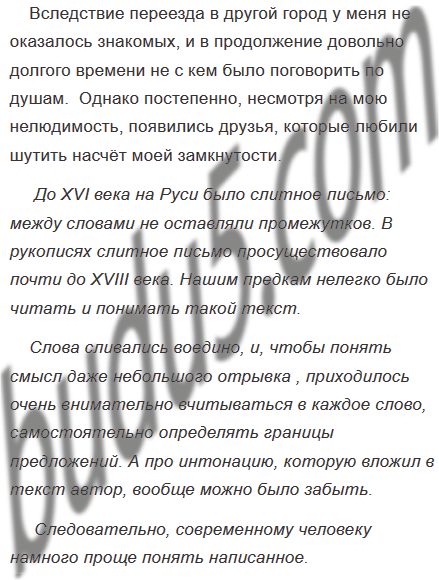 1. До XVI века на Руси было слитное письмо: между словами не оставляли промежутков. В рукописях слитное письмо просуществовало почти до XVIII века. Посмотрите, как выглядел такой текст.