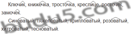 Синеватый, ключик, книжечка, тяжеловатый, тросточка, хрипловатый, креслице, росточек, розоватый, хитроватый, замочек, тесноватый.