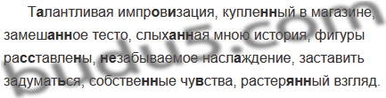 Т..лантливая импр..в..зация, купле(н, нн)ый в магазине. замеш..(н, нн)ое тесто, слых..(н, нн)ая мною история, фигуры ра(с, сс)тавле(н, нн)ы, (не)забываемое насл..ждение, заставить задумат(?)ся, собстве(н, нн)ые чу(?)ства, растер..(н, нн)ый взгляд.