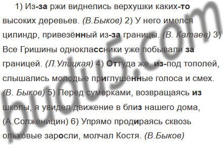 1) Из(за) ржи виднелись верхушки каких(то) высоких деревьев. (В. Быков) 2) У него имелся цилиндр, пр..везё(н,нн)ый из(за)границы. (В. Катаев) 3) Все Гришины однокла(с, сс)ники уже побывали (за)границей. (Л. Улицкая) 4) (От)туда же, (из)под тополей, слышались молодый пр..глушё(н, нн)ые голоса и смех. (В. Быков) 5) Перед сумерками, возвращаясь (из, со) школы, я увидел движение в близ(?) нашего дома. (А. Солженицин) 6) Упрямо прод..раясь сквоз(?) ольховые зар..сли, молчал Костя. (В.Быков)