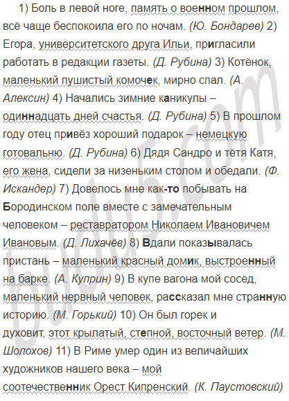 1) Боль в левой ноге память о вое(н, нн)ом прошлом всё чаще беспокоила его по ночам. (Ю. Бондарев) 2) Егора университетского друга Ильи пр..гласили работать в редакции газеты. (Д. Рубина) 3) Котёнок маленький пушистый комоч..к мирно спал. (А. Алексин) 4) Начались зимние к..никулы оди(н, нн)адцать дней счастья. (Д. Рубина) 5) В прошлом году отец пр..вёз хороший подарок немецкую готовальню. (Д. Рубина) 6) Дядя Сандро и тётя Катя его жена сидели за низеньким столом и обедали. (Ф. Искандер) 7) Довелось мне как(то) побывать на (Б, б)ородинском поле вместе с замечательным человеком реставратором Николаем Ивановичем Ивановым. (Д. Лихачёв) 8) (В)дали показ..ва-лась пристань маленький красный дом..к выстрое(н, нн)ый на барке. (А. Куприн) 9) В купе вагона мой сосед маленький нервный человек ра(с, сс)казал мне стра(н, нн)ую историю. (М. Горький) 10) Он был горек и духовит этот крылатый ст..пной восточный ветер. (М. Шолохов) 11) В Риме умер один из величайших художников нашего века мой соотечестве(н, нн)ик Орест Кипренский. (К. Паустовский)